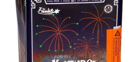 25 Schauss Batterie im Kaliber 25mm mit Goldschweifaufstieg zu Goldregenbuketts mit Verwandlungsspitzen in den folgenden