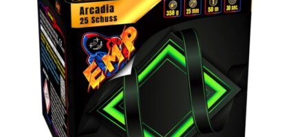 Brokatkronen und Titangoldpalmen mit roten und silbernen Blinksternbuketts und Schweifkometenaufstieg. EAN: 4250759503604 Hersteller: EMP Feuerwerk