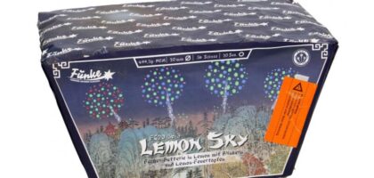Gefächerte Batterie mit Feuertöpfen in Lemon zu Silberschweif-Aufstieg und 4 verschiedenen Buketts aus Lemon-Blinkstern-Kombinationen, rasant