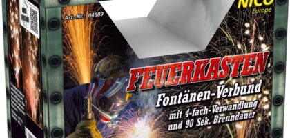 Pyrotechnischer Werkzeugkasten mit 4 Verwandlungs-Fontänen, mit weißen Blinksternen, Goldregen, Cracklingspitzen, Silberchrysanthemen, Knatterkronen und unzähligen bunten