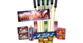 Hochwertiger Wellpappkarton mit 8 großen Raketen, 4 aufsteigenden Kreiseln, 4 Römischen Lichtern und weiteren 62