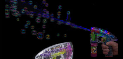 Die BLINXS LED Seifenblasenpistole ist transparent und mit vier hellen LEDs und einem Seifenblasenverteiler bestückt.