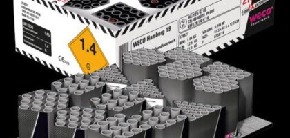Verbundfeuerwerk aus 13 Batterien. Fertig verleitet-in der praktischen Box! 3x 25-Schuss Goldflimmerkometen in rasanter Schussfolge,